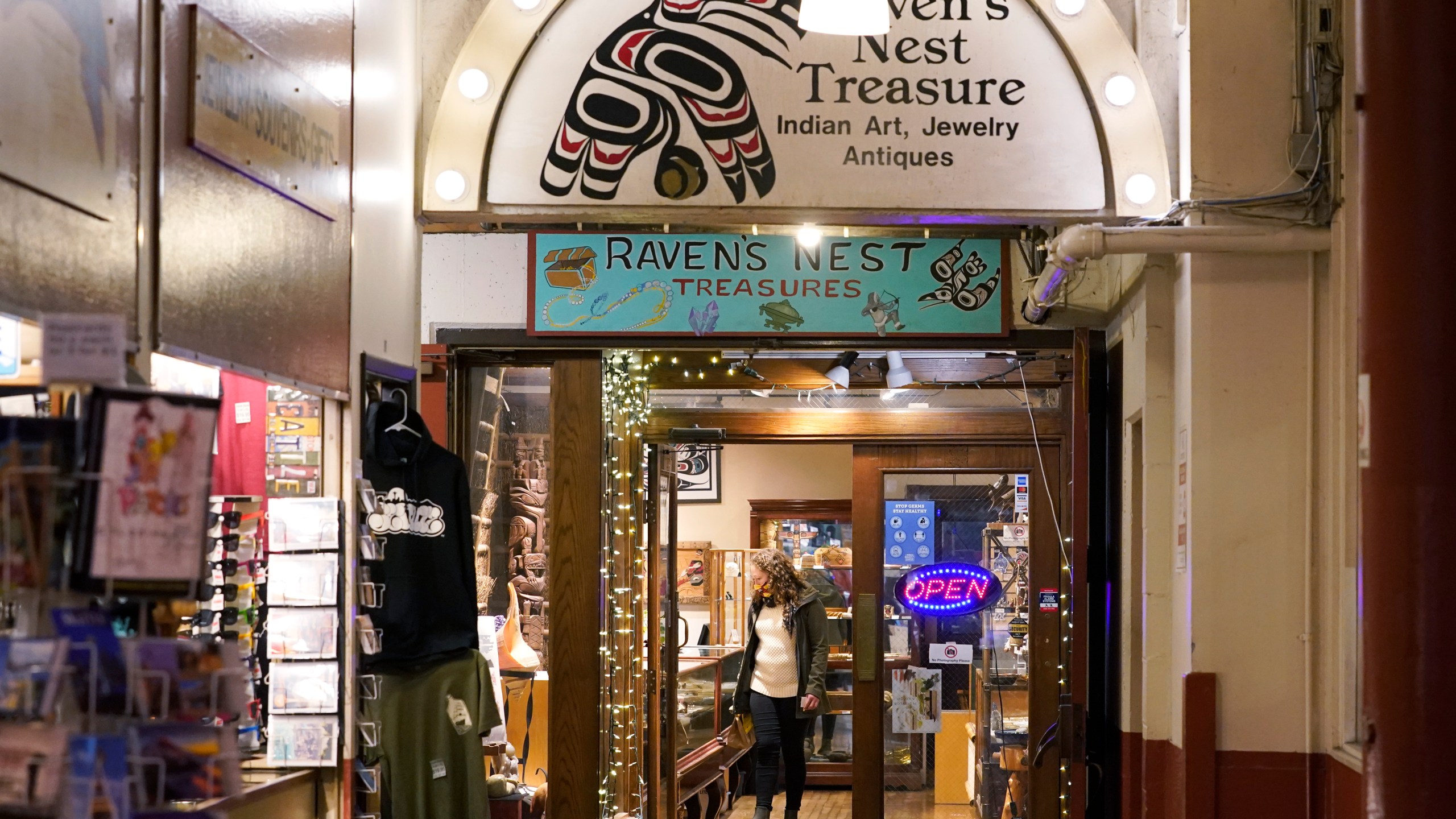 A person browses offerings in the Raven’s Nest Treasure shop in Pike Place Market, Friday, Dec. 10, 2021, in Seattle. Two artists are facing federal charges that they faked Native American heritage to sell works the shop and another gallery in downtown Seattle. The men were charged separately with violating the Indian Arts and Crafts Act, which prohibits misrepresentation in marketing American Indian or Alaska Native arts and crafts. (AP Photo/Ted S. Warren)
