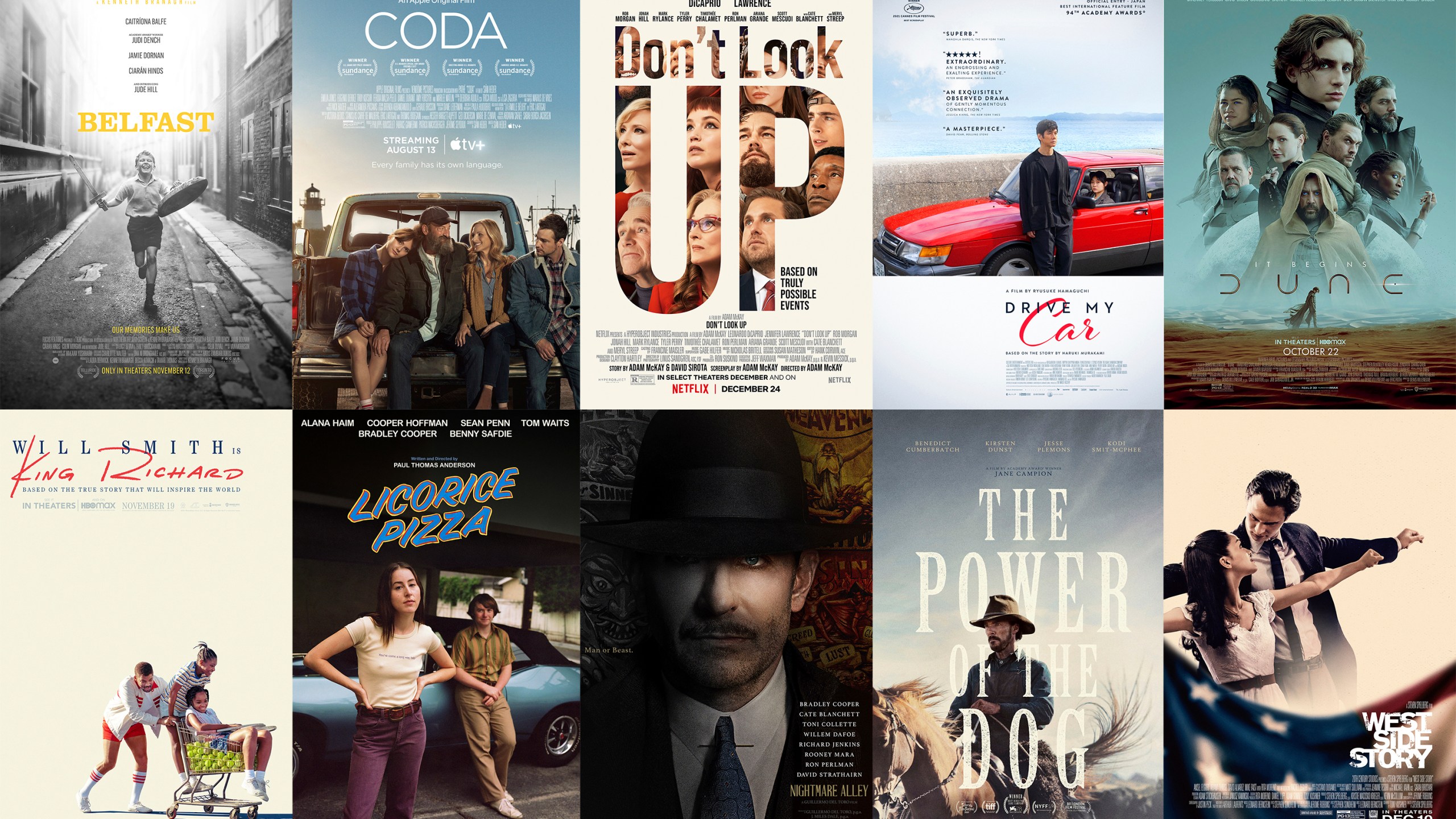 The Nominees: “Belfast”; “CODA”; “Don’t Look Up”; “Drive My Car”; “Dune”; “King Richard”; “Licorice Pizza”; “Nightmare Alley”; “The Power of the Dog”; “West Side Story.”
