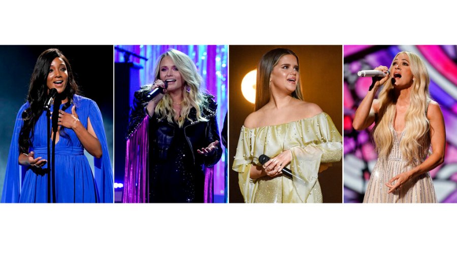 This combination photo shows Mickey Guyton, from left, Miranda Lambert, Maren Morris and Carrie Underwood performing at the 56th annual Academy of Country Music Awards in Nashville, Tenn. The awards show aired on April 18 with both live and prerecorded segments. Underwood brought the Academy of Country Music Awards to church. Morris won two honors, including song of the year, Lambert performed three times and held onto her record as the most decorated winner in ACM history and Guyton, the first Black woman to host the awards show, gave a powerful, top-notch vocal performance. (AP Photo)