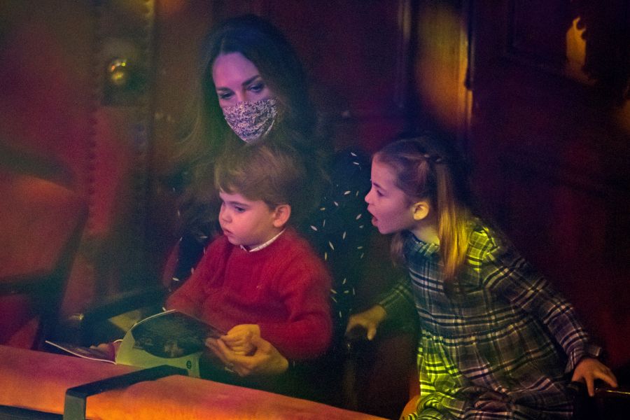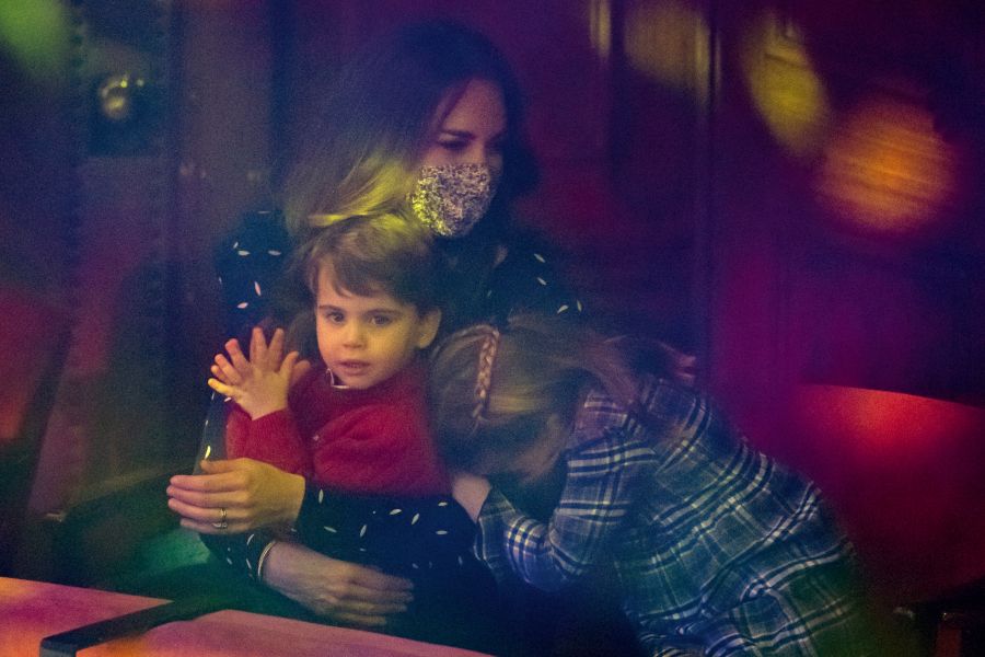 Britain’s Kate, Duchess of Cambridge, Prince Louis and Princess Charlotte attend a special pantomime performance at London’s Palladium Theatre, Friday Dec. 11, 2020, hosted by The National Lottery, to thank key workers and their families for their efforts throughout the COVID-19 pandemic. (Aaron Chown/Pool via AP)
