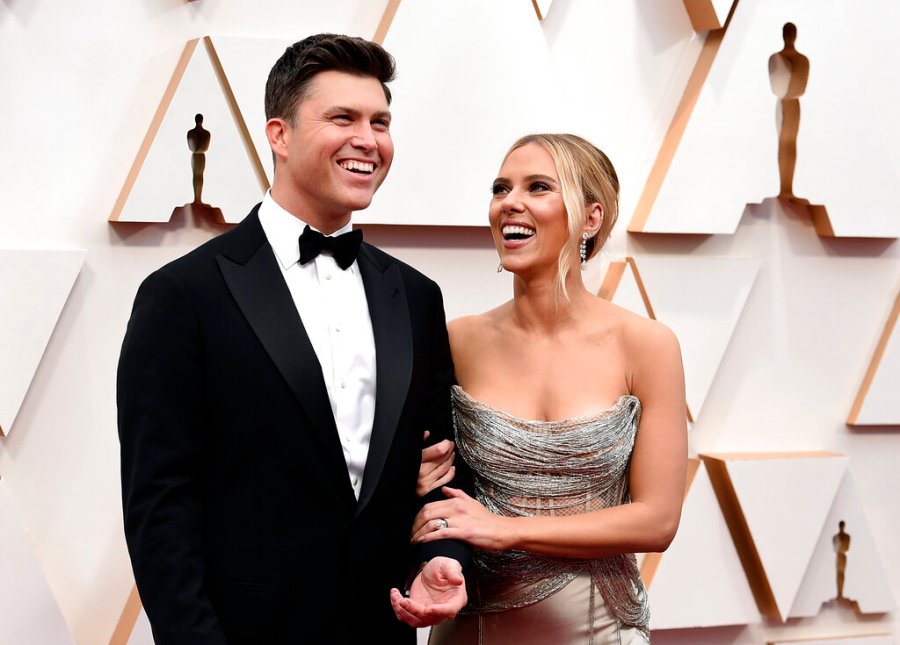 FILE – Colin Jost, left, and Scarlett Johansson arrive at the Oscars in Los Angeles on Feb. 9, 2020. The married couple, who once made comedy skits on “Saturday Night Live,” are reuniting onscreen for a new Super Bowl commercial. The 60-second ad launches Monday, Feb. 7, 2022, and will be televised during Super Bowl 56 on Feb. 13. (Photo by Jordan Strauss/Invision/AP, File)
