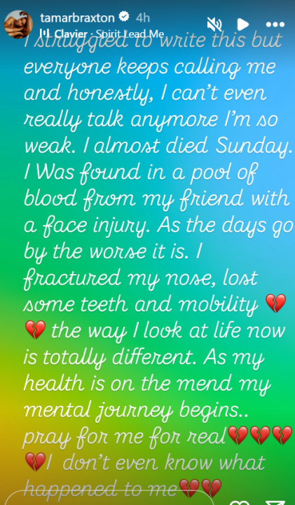 In an Instagram story posted Tuesday afternoon, Braxton said, “I struggled to write this, but everyone keeps calling me, and honestly, I can’t even really talk anymore I’m so weak.