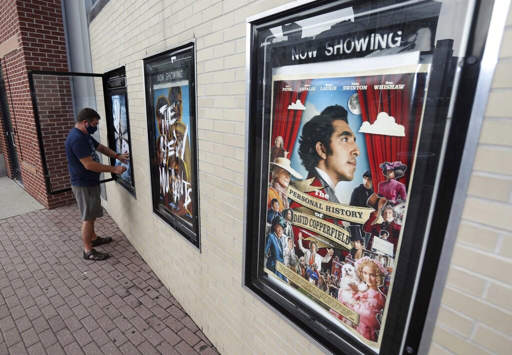 Blaze Kopec General Manager of R/C Wilkes-Barre Pa Movies 14 tucks in a movie poster for the Christopher Nolan film Tenet which will begin showing next week, Friday Aug. 28, 2020 in Wilkes Barre, Pa. (Dave Scherbenco/The Citizens’ Voice via AP)