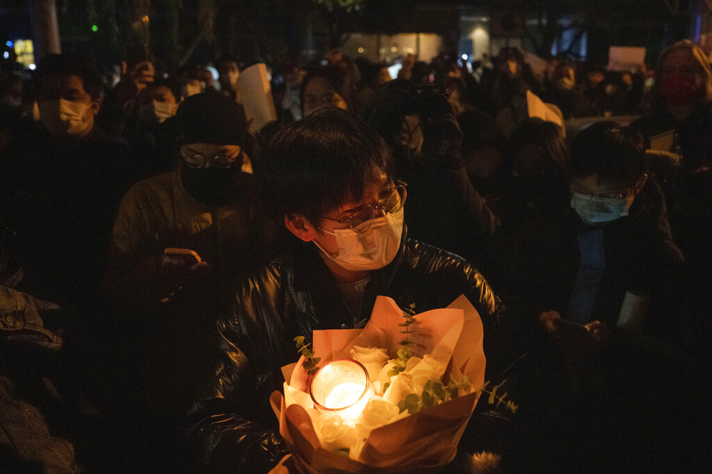 A protester holds flower and candles in Beijing, Sunday, Nov. 27, 2022. Protesters angered by strict anti-virus measures called for China’s powerful leader to resign, an unprecedented rebuke as authorities in at least eight cities struggled to suppress demonstrations Sunday that represent a rare direct challenge to the ruling Communist Party. (AP Photo/Ng Han Guan)