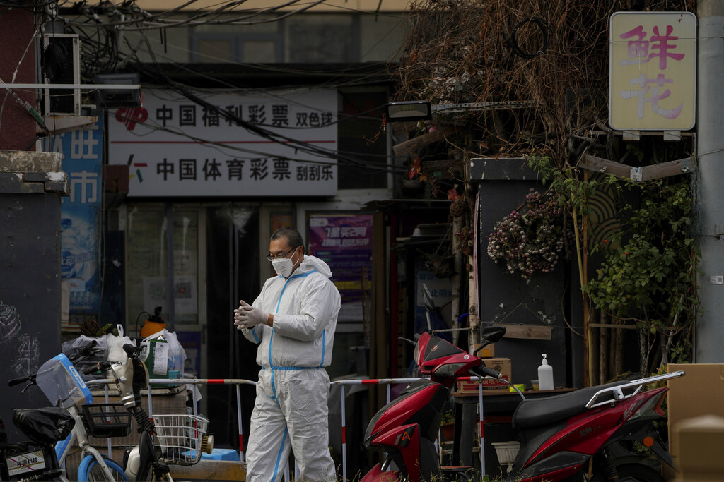 A worker in protective gear sanitizes his gloves outside a locked down neighborhood as part of COVID-19 controls in Beijing, Monday, Nov. 28, 2022. Authorities eased anti-virus rules in scattered areas but affirmed China’s severe “zero- COVID” strategy Monday after crowds demanded President Xi Jinping resign during protests against controls that confine millions of people to their homes. (AP Photo/Andy Wong)