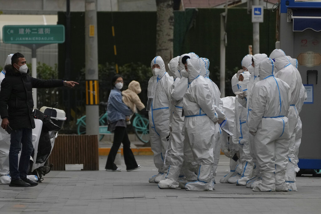 Workers in protective gear gather for their duties in Beijing, Monday, Nov. 28, 2022. Authorities eased anti-virus rules in scattered areas but affirmed China’s severe “zero- COVID” strategy Monday after crowds demanded President Xi Jinping resign during protests against controls that confine millions of people to their homes. (AP Photo/Andy Wong)