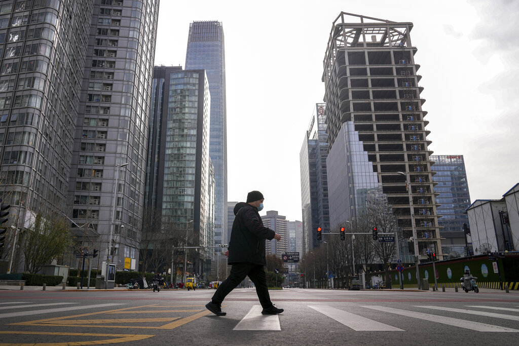 A man walks through the deserted central business district of Beijing, Monday, Nov. 28, 2022. Authorities eased anti-virus rules in scattered areas but affirmed China’s severe “zero- COVID” strategy Monday after crowds demanded President Xi Jinping resign during protests against controls that confine millions of people to their homes. (AP Photo/Andy Wong)