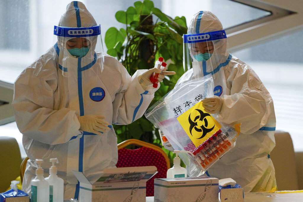 Health workers wearing protective suits put COVID-19 test samples into a bag at a hotel used for people to stay during a period of health quarantine Sunday, March 20, 2022, in the Yanqing district of Beijing. (AP Photo/Andy Wong)