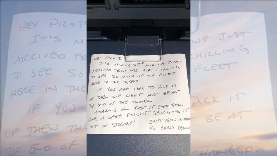 Chris Dennis left the note as something of a “time capsule” after seeing a “shocking” number of out-of-service aircraft parked at the Victorville Airport. (Delta Air Lines/Chris Dennis)