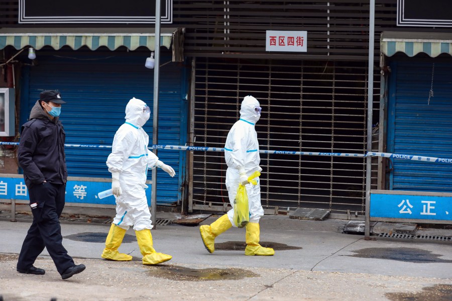 FILE – In this Jan. 27, 2020, file photo, workers in protective gear carry a bag containing a giant salamander that was reported to have escaped from the Huanan Seafood Market in Wuhan in central China’s Hubei Province. A 10-member team of international researchers from the World Health Organization hopes to find clues as to the origin of the coronavirus pandemic in the central Chinese city of Wuhan where the virus was first detected in late 2019. (Chinatopix via AP, File)