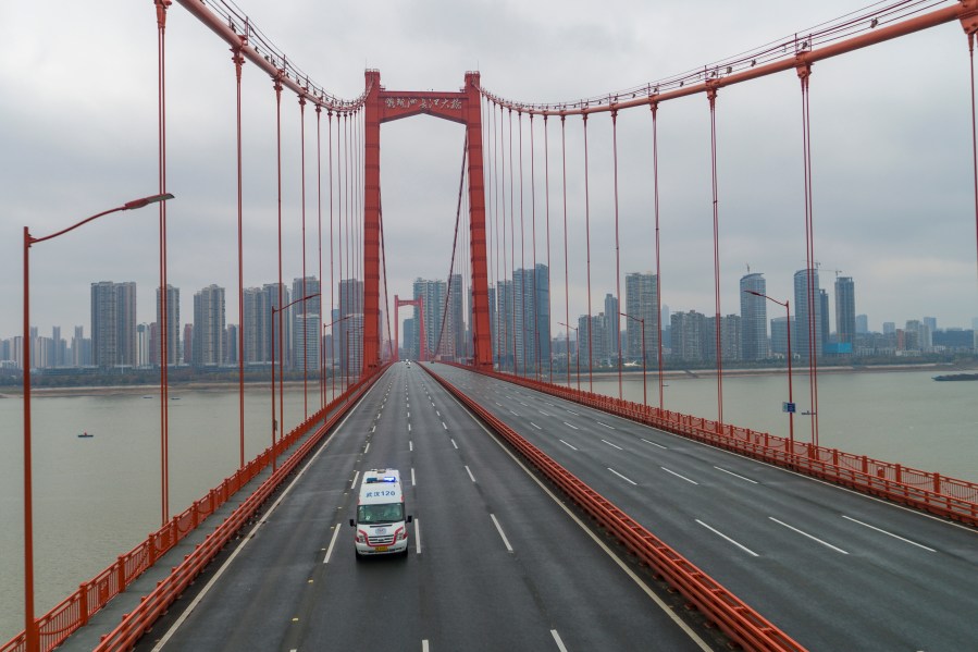 FILE – In this Saturday, Jan. 25, 2020, file photo, an ambulance drives across a nearly empty bridge in Wuhan in central China’s Hubei Province. A 10-member team of international researchers from the World Health Organization hopes to find clues as to the origin of the coronavirus pandemic in the central Chinese city of Wuhan where the virus was first detected in late 2019. (Chinatopix via AP, File)