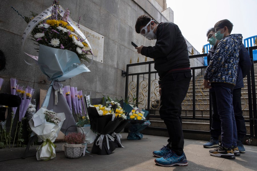 FILE – In this April 4, 2020, file photo, residents wearing masks stand in front of flowers placed near the Heroes Memorial Monument after a national moment of mourning for victims of coronavirus in Wuhan in central China’s Hubei Province. A 10-member team of international researchers from the World Health Organization hopes to find clues as to the origin of the coronavirus pandemic in the central Chinese city of Wuhan where the virus was first detected in late 2019. (AP Photo/Ng Han Guan, File)
