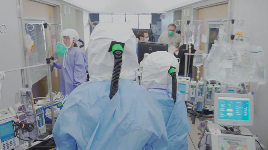 The day-to-day has changed for these doctors and nurses who spend stretches of time in the process of what they call donning and doffing, the careful putting on and taking off protective gear called PAPR or powered air-purifying respirators, that push air down so that inhalation is limited.