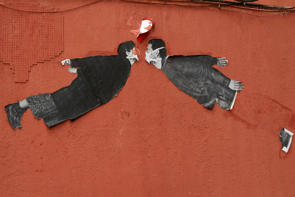 MADRID, SPAIN – APRIL 30: A mural of two people with face masks facing each other adorns a wall on April 30, 2020 in Madrid, Spain. Since April 27 children under 12 are allowed to come and go from their homes more freely. Spain has had more than 213,400 confirmed cases of COVID-19 and over 24,500 reported deaths, although the rate has declined after weeks of lockdown measures. (Photo by Carlos Alvarez/Getty Images)