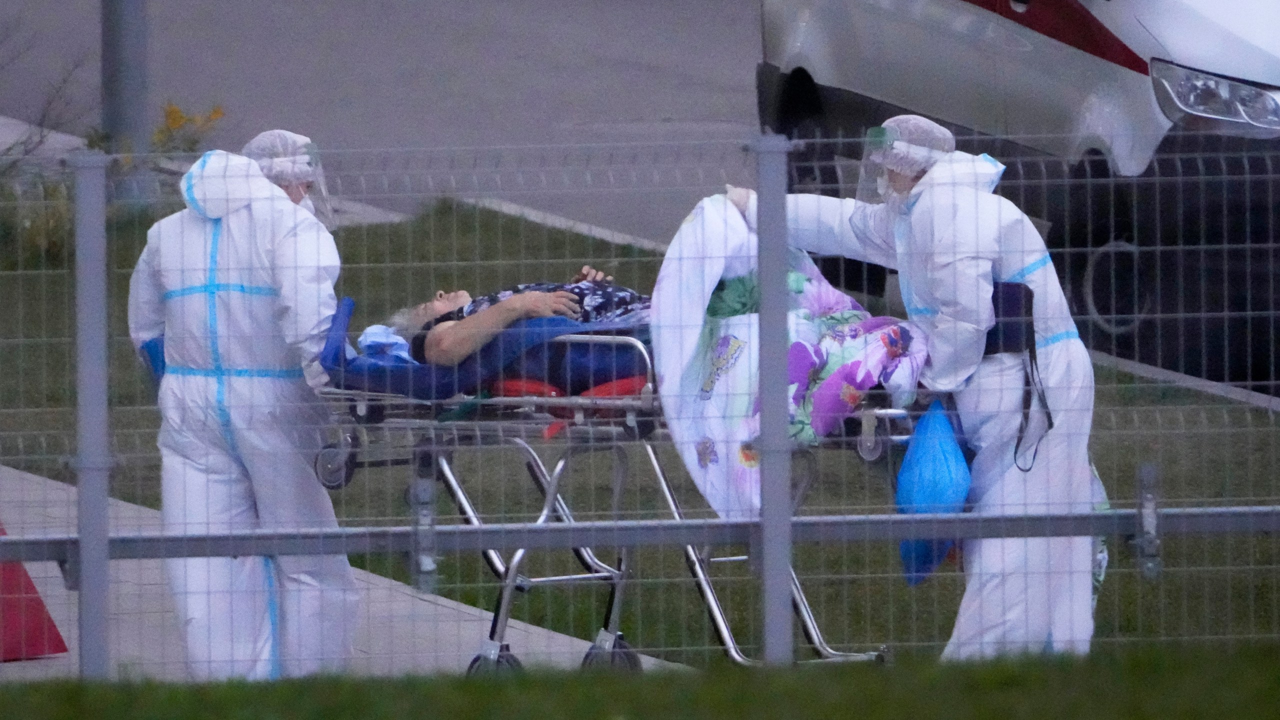 Medical workers carry a patient suspected of having coronavirus on a stretcher at a hospital in Kommunarka, outside Moscow, Russia, Saturday, Oct. 16, 2021. Russia’s daily death toll from COVID-19 has exceeded 1000 for the first time as the country faces a sustained wave of rising infections. (AP Photo/Alexander Zemlianichenko)