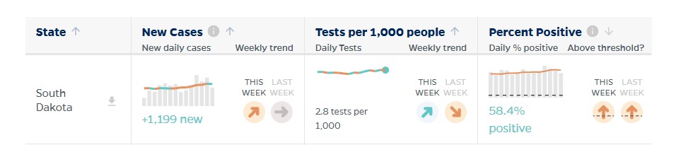South Dakota’s percent positive rate is the second-highest in the nation at 58.4%, according to Johns Hopkins University data on Monday.
