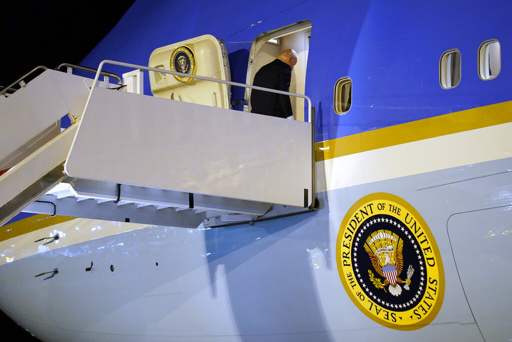 President Joe Biden boards Air Force One at Edinburgh Airport after attending the UN Climate Change Conference COP26, Tuesday, Nov. 2, 2021, in Edinburgh, Scotland. (AP Photo/Evan Vucci)