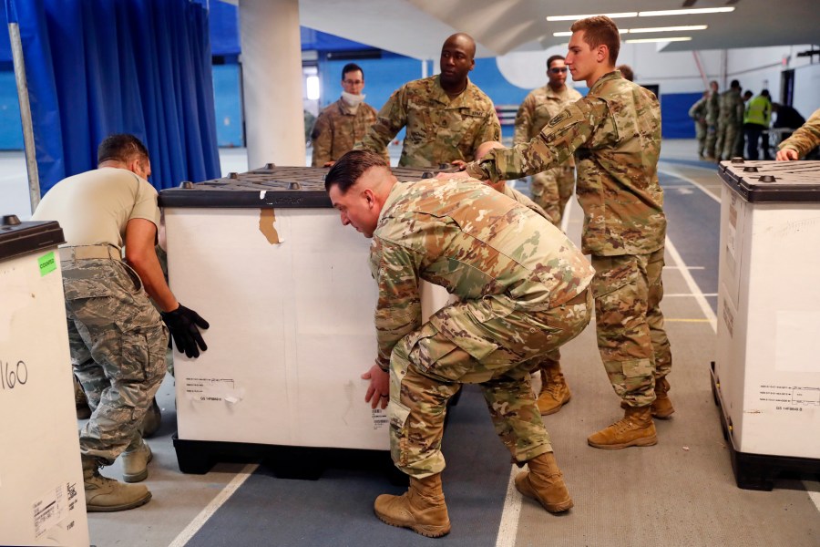 FILE- In this March 31, 2020 file photo, members of the Connecticut Air and Army National Guard unload hospital supplies referred to as “hospitals in a box” at Southern Connecticut State University’s Moore Field House in New Haven, Conn. Connecticut has received approval to continue using the National Guard to support COVID-19 mitigation efforts through March, 2021. (AP Photo/Kathy Willens, File)