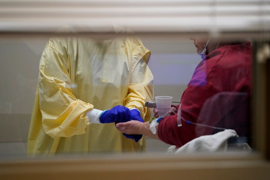 FILE – In this Nov. 24, 2020, file photo, registered nurse Chrissie Burkhiser, left, hands medication to a COVID-19 patient inside the emergency room at Scotland County Hospital in Memphis, Mo. States faced a deadline on Friday, Dec. 4, 2020, to place orders for the coronavirus vaccine as many reported record infections, hospitalizations and deaths, while hospitals were pushed to the breaking point — with the worst feared yet to come. (AP Photo/Jeff Roberson, File)