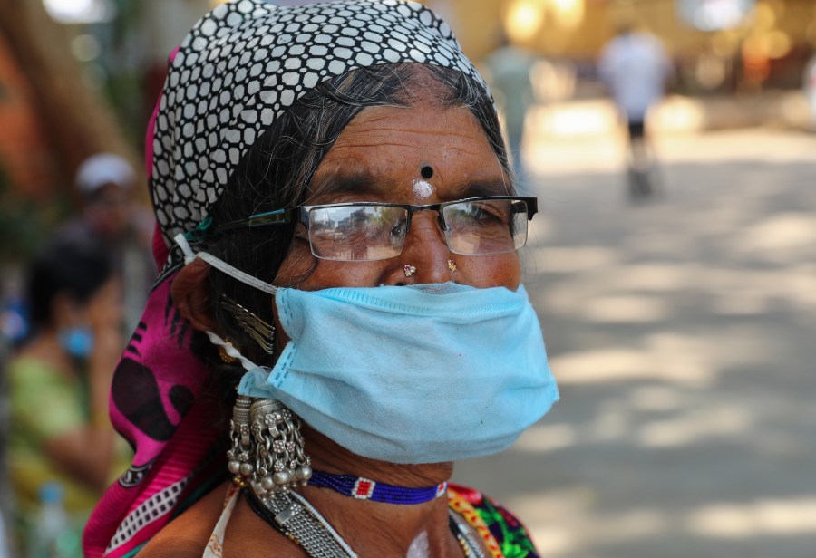 An Indian tribal woman wearing a face mask as a precaution against the coronavirus stands in front of a hospital for a general checkup in Hyderabad, India, Saturday, Dec. 5, 2020. India is second behind the U.S. in total coronavirus cases. Its recovery rate is nearing 94%. (AP Photo/Mahesh Kumar A.)
