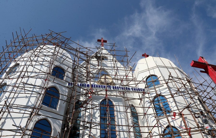 Indian workers paint a church ahead of Christmas in Hyderabad, India, Saturday, Dec. 5, 2020. Christians make up about 2 percent of India’s 1 billion-plus population. (AP Photo/Mahesh Kumar A.)