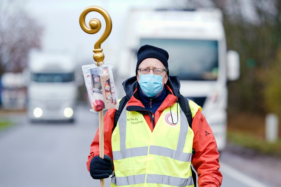 Pastor Michael Ohlemueller is standing at the motorway service station Wonnegau near Worms, Germany, with a crosier with chocolate Santa Claus and apple in a bag, which he wants to distribute as a gift to truck drivers. The action is intended as a thank you and appreciation for the drivers’ work. ( Uwe Anspach/dpa via AP)