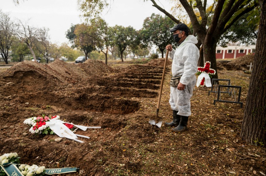 A worker stands over graves during a funeral ceremony for a person who died of COVID-19, in the northern city of Thessaloniki, Greece, Saturday, Dec. 5, 2020. Greece is on lockdown until Dec. 7 but government officials say it is too early to say when schools and businesses will reopen due to continued pressure on the state-run health service, with intensive care wards near capacity in parts of the country. (AP Photo/Giannis Papanikos)