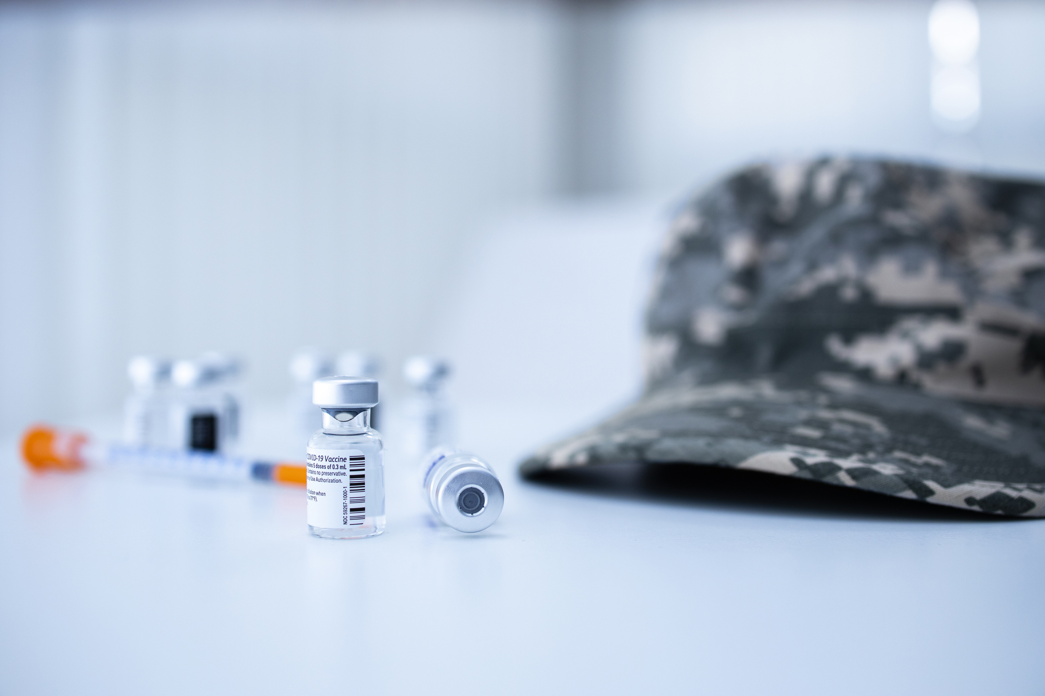 Military vaccination and immunization. Close up view of covid-19 vaccine ampoules and syringe to fight corona virus pandemic.