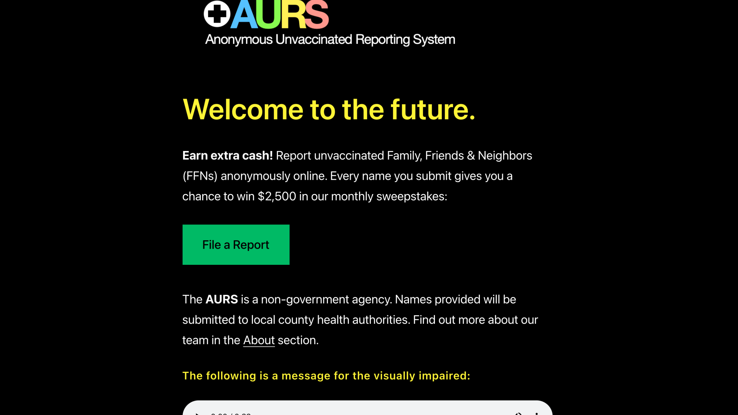 A screenshot shows the short-lived AURS parody site, which prompted Californians to report the names of unvaccinated people they know.