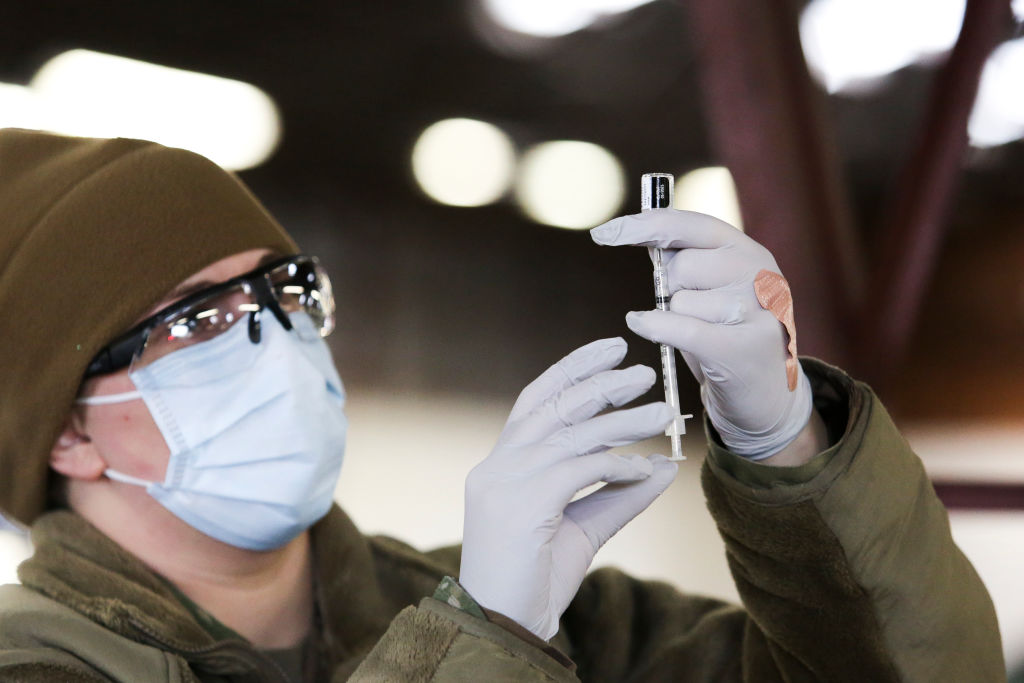 Air National Guard Medic Stf Sgt. Melinda Grounds prepares Covid-19 vaccinations at one of the four Covid-19 mass vaccination sites opened by the Washington State Department of Health at the Clark County Fairgrounds in Ridgefield, Washington on January 26, 2021. (Photo by JASON REDMOND/AFP via Getty Images)
