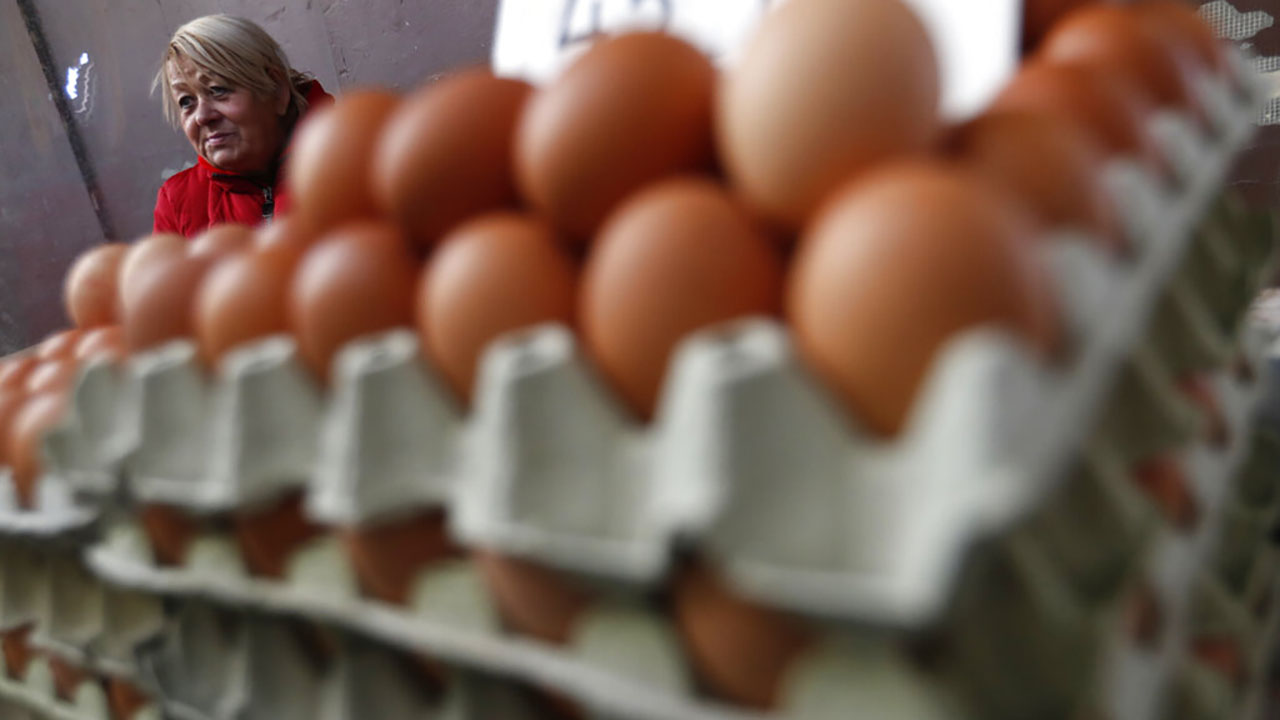 FILE: Vendor Judit Sos sells eggs in a food market in Budapest, Hungary, Nov. 20, 2021. (AP Photo/Laszlo Balogh)