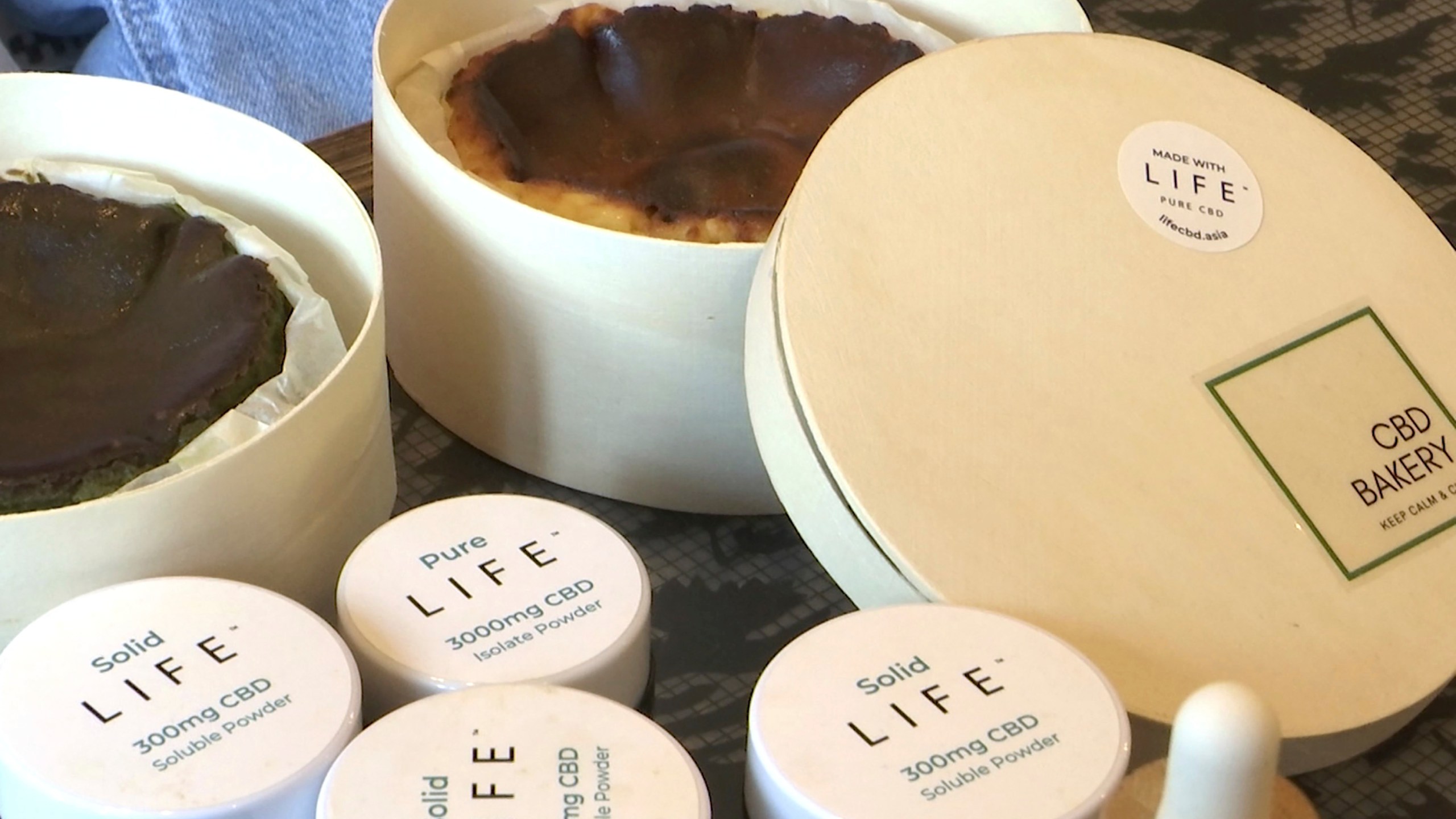 In this image made from a video, cheesecakes made with CBD, CBD powder and water-soluble CBD sold by the CBD Bakery online shop are seen in Hong Kong, Monday, Jan. 30, 2023. Hong Kong banned cannibidiol, also known as CBD, as a “dangerous drug” and imposed harsh penalties for possession on Wednesday, forcing fledging businesses to shut down and revamp. (AP Photo/Alice Fung)