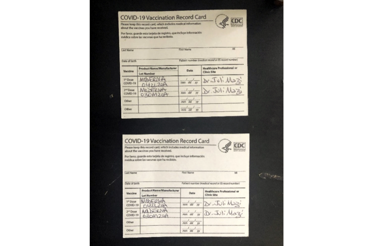 In July, the investigator said in court papers, he received a package containing a CDC COVID-19 vaccination card marked with the name and date of birth he provided and a cellphone screenshot showing that the information he provided had also been added to the state database.