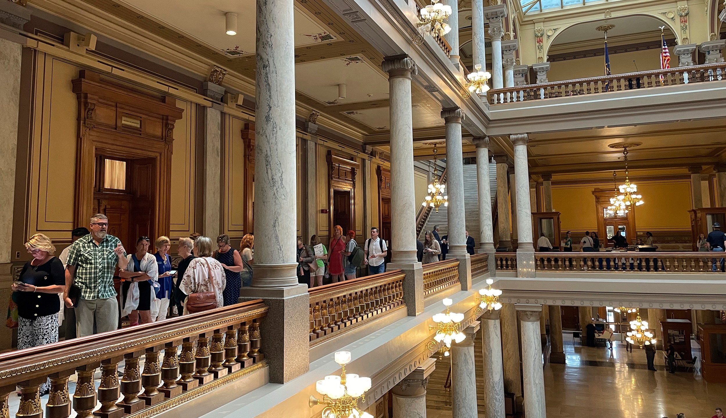 People line up outside the Indiana House chamber in Indianapolis, Tuesday, Aug. 2, 2022, ahead of its morning session to hear testimony on the Senate-approved abortion ban now in consideration by the House. (AP Photo/Arleigh Rodgers)