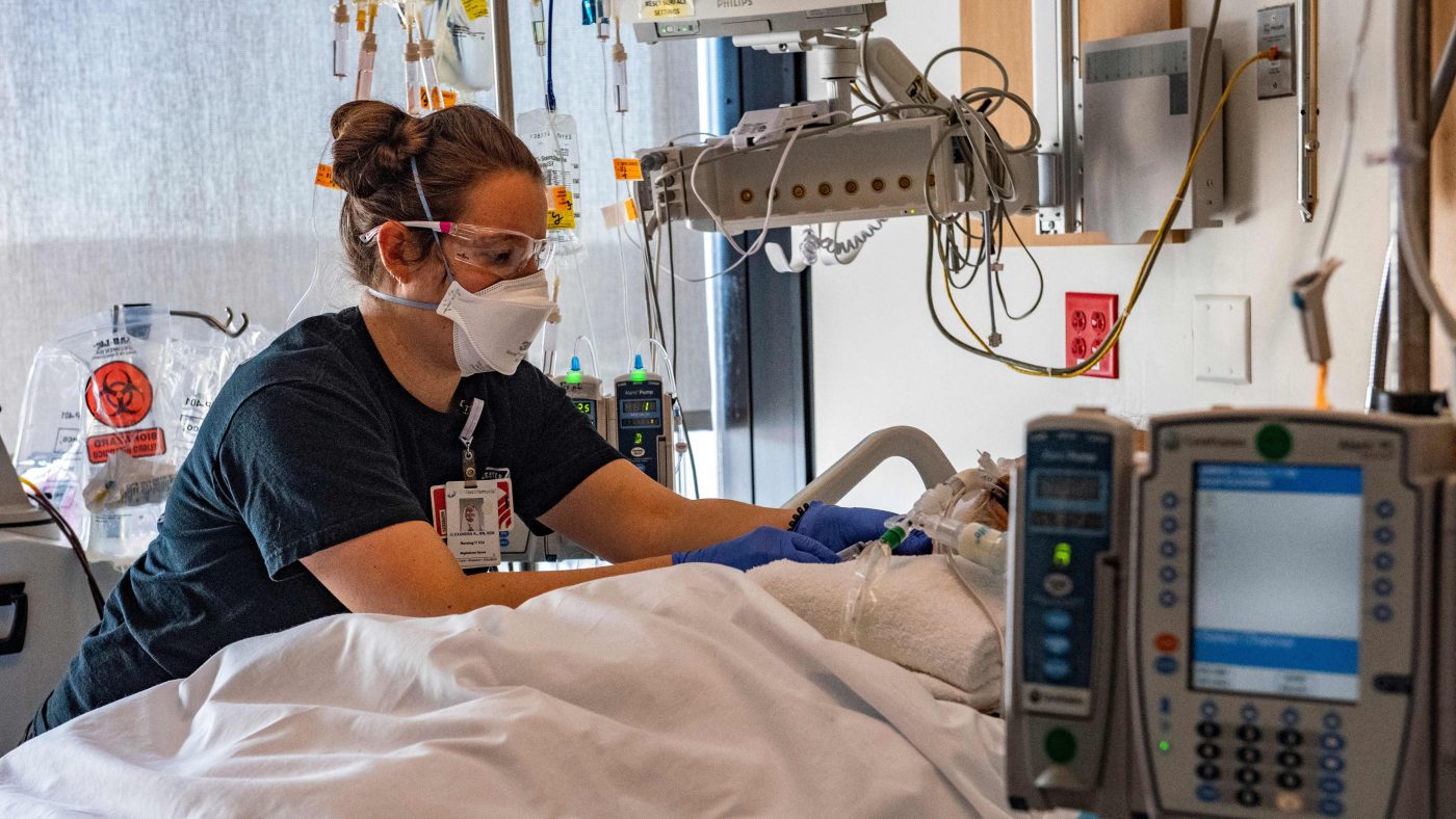 A medical worker treats a non-COVID-19 patient, who is just in a room besides rooms with COVID patients, in the ICU ward at UMass Memorial Medical Center in Worcester, Massachusetts on January 4, 2022. (JOSEPH PREZIOSO/AFP via Getty Images)