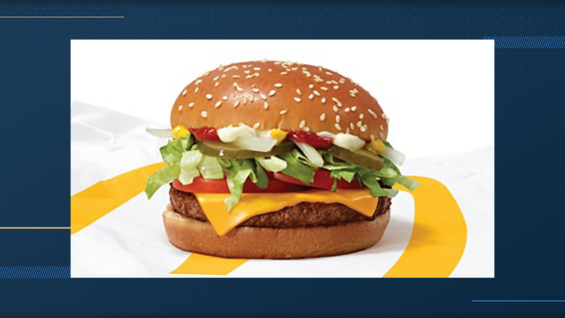 The McPlant burger includes a plant-based patty developed with Beyond Meat made from peas, rice and potatoes. The patty is topped with all the fixings: tomato, pickles, mayonnaise, ketchup, mustard and a slice of American cheese. The burger is served on a sesame seed bun.