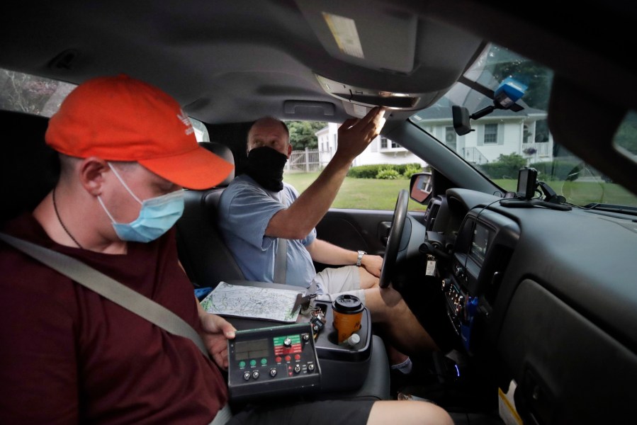 Chris Gagnon, center, field operations manager for the East Middlesex Mosquito Control Project, prepares to spray to control mosquitos from a pick-up truck with co-worker Peter Mirata, left, on Wednesday, July 8, 2020, while driving through a neighborhood in Burlington, Mass. Officials are preparing for another summer with a high number of cases of eastern equine encephalitis, a rare but severe neurological illness transmitted by mosquitoes that hit the state particularly hard last summer. (AP Photo/Charles Krupa)