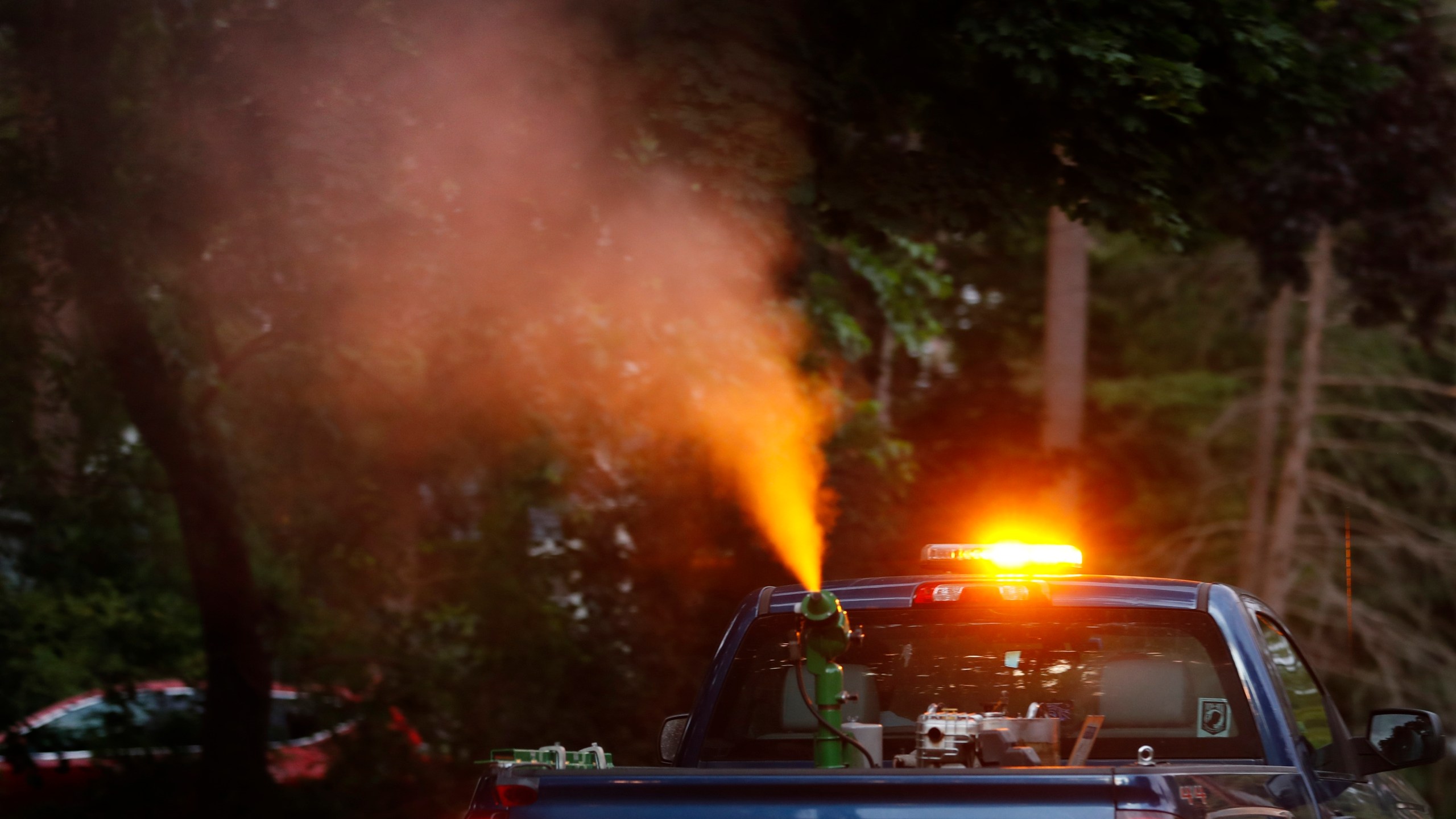 A crew from the East Middlesex Mosquito Control Project spray to control mosquitos from a pick-up truck on Wednesday, July 8, 2020, while driving through a neighborhood in Burlington, Mass. Officials are preparing for another summer with a high number of cases of eastern equine encephalitis, a rare but severe neurological illness transmitted by mosquitoes that hit the state particularly hard last summer. (AP Photo/Charles Krupa)