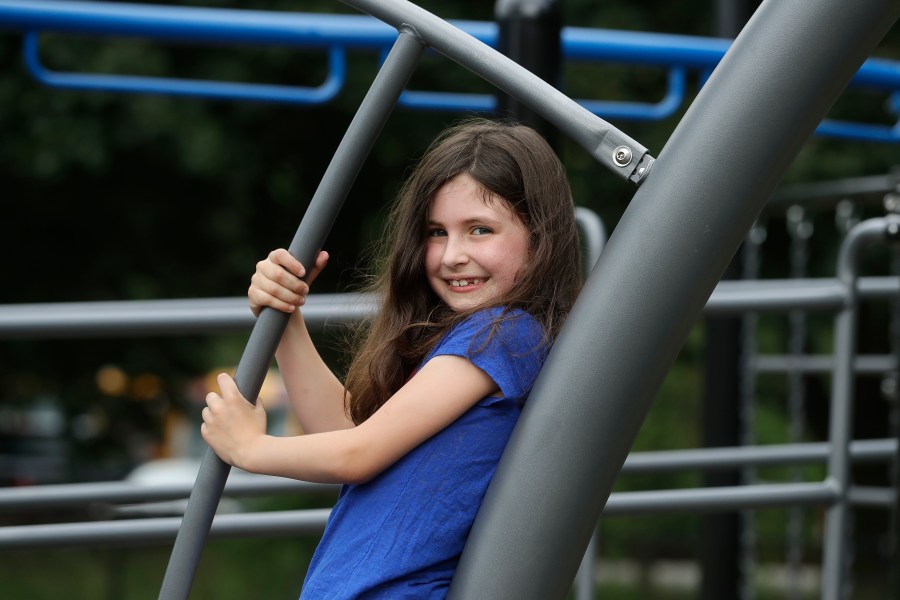 Sophia Garabedian, 6, of Sudbury, Mass., who contracted Eastern Equine Encephalitis in 2019, stands for a photograph on a playground, Wednesday, July 8, 2020, in Sudbury. (AP Photo/Steven Senne)