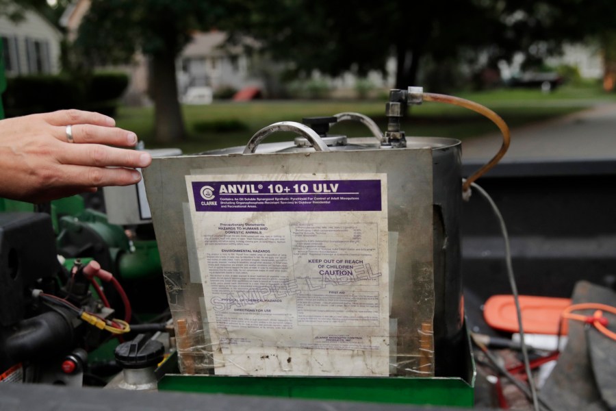 Chris Gagnon, field operations manager for the East Middlesex Mosquito Control Project, points out the type of product that will be sprayed for mosquito control on Wednesday, July 8, 2020, prior to driving through a neighborhood in Burlington, Massachusetts. Officials are preparing for another summer with a high number of cases of eastern equine encephalitis, a rare but severe neurological illness transmitted by mosquitoes that hit the state particularly hard last summer. (AP Photo/Charles Krupa)