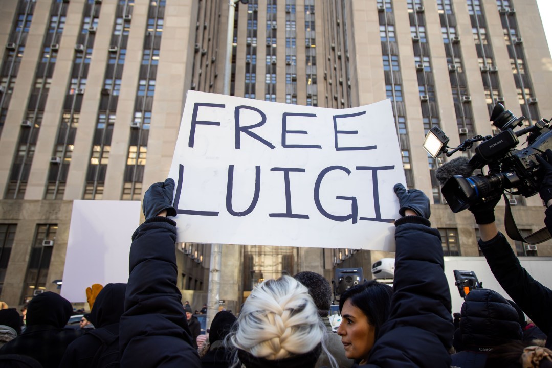 NEW YORK, NEW YORK – DECEMBER 23: A protestor holds a sign outside of Manhattan Criminal Court on December 23, 2024 in New York City. Luigi Mangione appeared for his arraignment on state murder charges in the killing of UnitedHealthcare CEO Brian Thompson. (Andrew Lichtenstein/Corbis via Getty Images)
