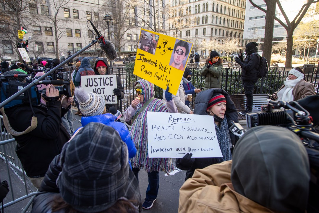Demonstrators across from Manhattan Criminal Court during the arraignment of Luigi Mangione, the suspect in the killing of a UnitedHealth Group Inc. chief executive officer Brian Thompson, in New York, US, on Monday, Dec. 23, 2024. Mangione pleaded not guilty to New York state murder charges Monday over the shooting of a top UnitedHealth Group Inc. executive, kicking off a high-profile case that will likely be the first to go to trial. Photographer: Michael Nagle/Bloomberg via Getty Images