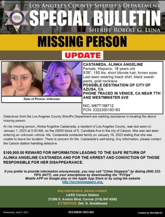 Anyone with information about Castaneda should call the Sheriff’s Department at 310-847-8362.