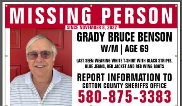 • Bruce Benson disappeared in Cotton County, Oklahoma, in November 2022