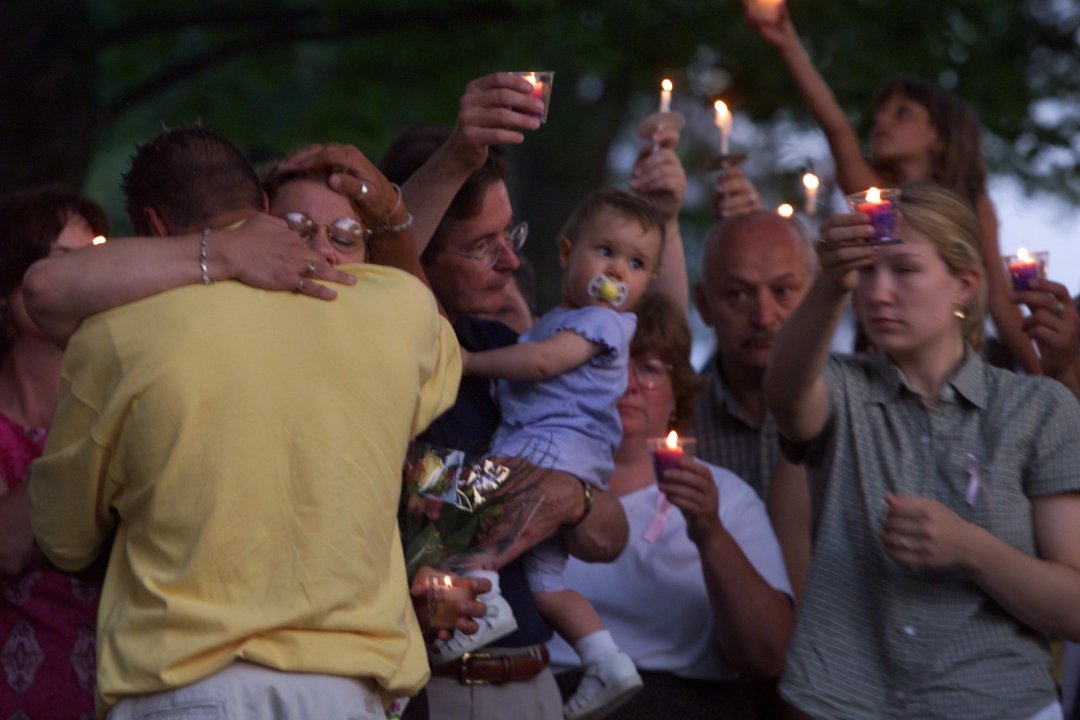 WARREN, MA – JULY 1: At left, Magi Bish hugs John Bish Jr. during a candle light vigil in the Common of Warren, MA for Molly Ann Bish on July 1, 2000. Molly Ann Bish (August 2, 1983 June 27, 2000) was a sixteen-year-old American girl from rural Worcester County, Massachusetts, who disappeared while working as a lifeguard in her hometown of Warren, Massachusetts. Her remains were found three years later in neighboring Hampden County after what became the largest search in the state’s history. (Photo by Dominic Chavez/The Boston Globe via Getty Images)