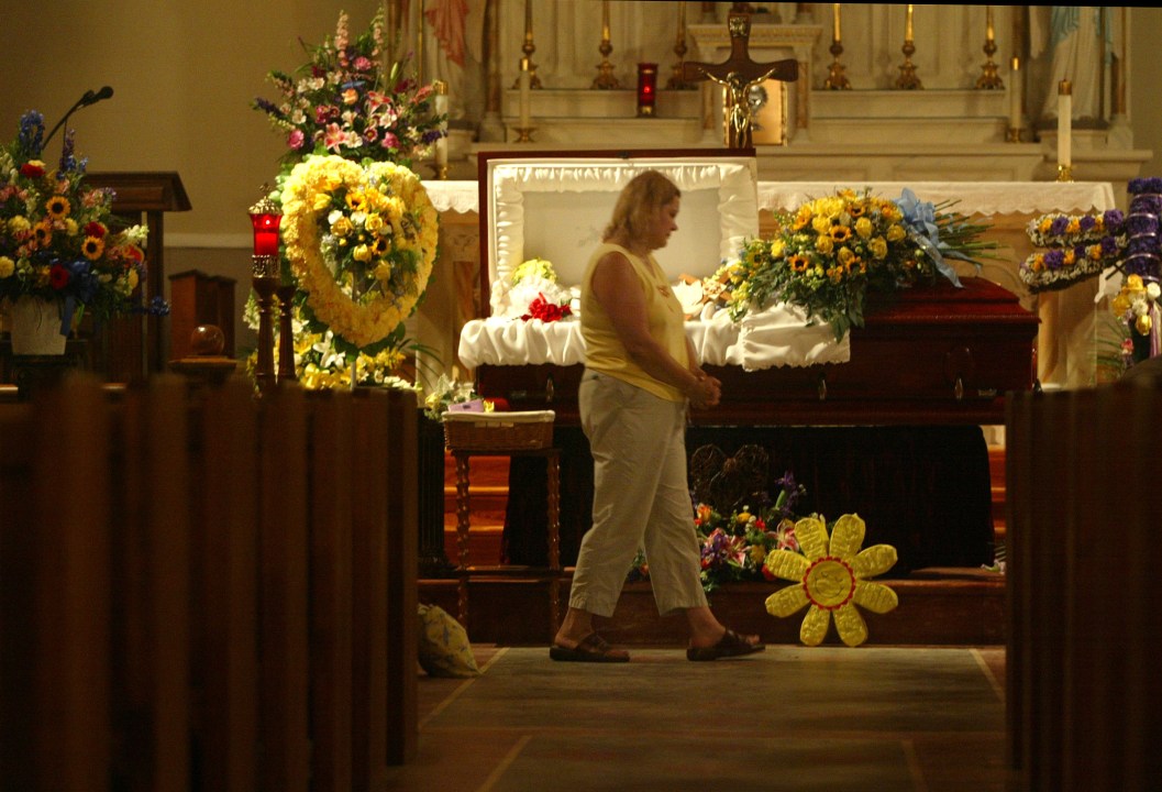 WARREN, MA – AUGUST 2: Magi Bish paces in front of the small casket inside a full-size one which contains the remains of her daughter Molly inside the St. Thomas Aqinas Church in West Warren, MA following Molly’s wake at around 1:30 AM on Aug. 2, 2003. The family held an all night vigil at the church. “I don’t want her to spend another night alone, ” said John Bish. Molly Anne Bish (August 2, 1983 June 27, 2000) was a sixteen-year-old American girl from rural Worcester County, Massachusetts, who disappeared while working as a lifeguard in her hometown of Warren, Massachusetts. Her remains were found three years later in neighboring Hampden County after what became the largest search in the state’s history. (Photo by Bill Greene/The Boston Globe via Getty Images)