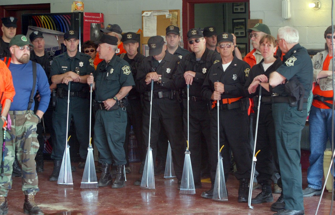 WARREN, MA – JUNE 3: Massachusetts Environmental Police officers gather at the W. Warren, MA fire dept. on June 3, 2003 to get their marching orders before searching the woods in Palmer for Molly Bish. Molly Anne Bish (August 2, 1983 June 27, 2000) was a sixteen-year-old American girl from rural Worcester County, Massachusetts, who disappeared while working as a lifeguard in her hometown of Warren, Massachusetts. Her remains were found three years later in neighboring Hampden County after what became the largest search in the state’s history. (Photo by Bill Greene/The Boston Globe via Getty Images)
