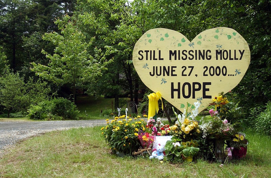 (5/20/03,Warren,MA) BISHThe search for Molly Bish heats up again after the swimming suit she was wearing at the time of dissapearance possibly is found. Bish dissapeared from her lifeguard duties at Cummins Pond in Warren, June 27, 2000. Molly’s parents, John and Magdalen in front of a sign in their front yard.65BD9187.JPG Boston Herald Staff Photo by George Martell. Saved in Wednesday (Photo by George Martell/MediaNews Group/Boston Herald via Getty Images)