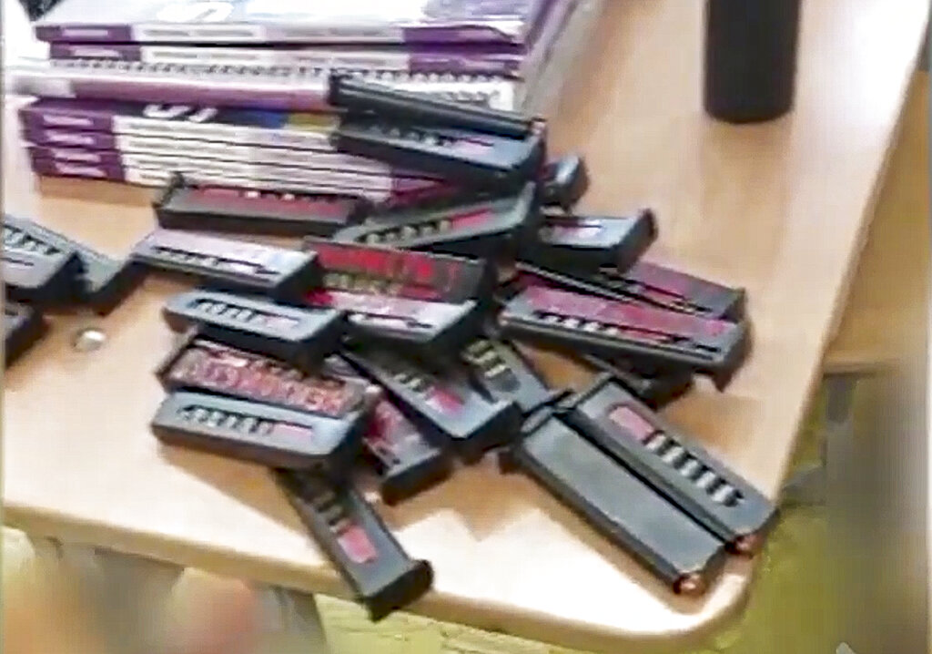 In this handout image taken from video released by the Russian Investigative Committee, ammunition are seen on a table at the scene of a shooting at school No. 88 in Izhevsk, Russia, Monday, Sept. 26, 2022. A gunman on Monday morning killed 13 people and wounded 21 others in a school in central Russia, authorities said. Russia’s Investigative Committee said in statement that seven children were among those killed in the shooting in the school in Izhevsk, a city about 960 kilometers (596 miles) east of Moscow in the Udmurtia region. (Russian Investigative Committee via AP)
