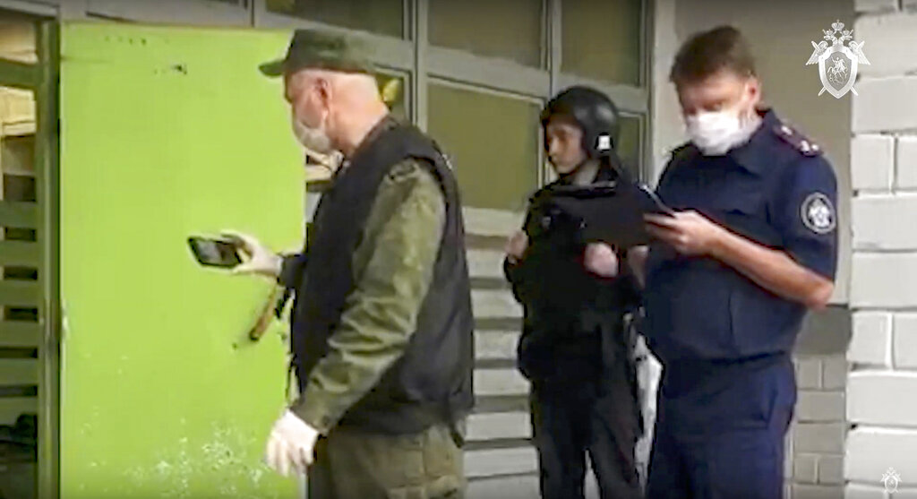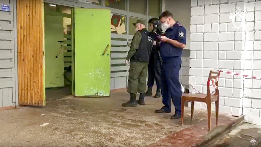 In this handout image taken from video released by the Russian Investigative Committee, employees of the Russian Investigative Committee work at the scene of a shooting at school No. 88 in Izhevsk, Russia, Monday, Sept. 26, 2022. A gunman on Monday morning killed 13 people and wounded 21 others in a school in central Russia, authorities said. Russia’s Investigative Committee said in statement that seven children were among those killed in the shooting in the school in Izhevsk, a city about 960 kilometers (596 miles) east of Moscow in the Udmurtia region. (Russian Investigative Committee via AP)